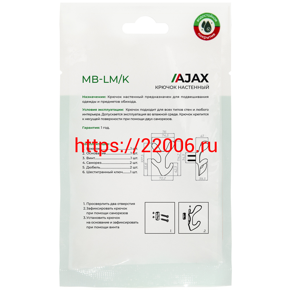- Крючок Ajax (Аякс) настенный MB-LM/K-005 WH белый в Казани недорого